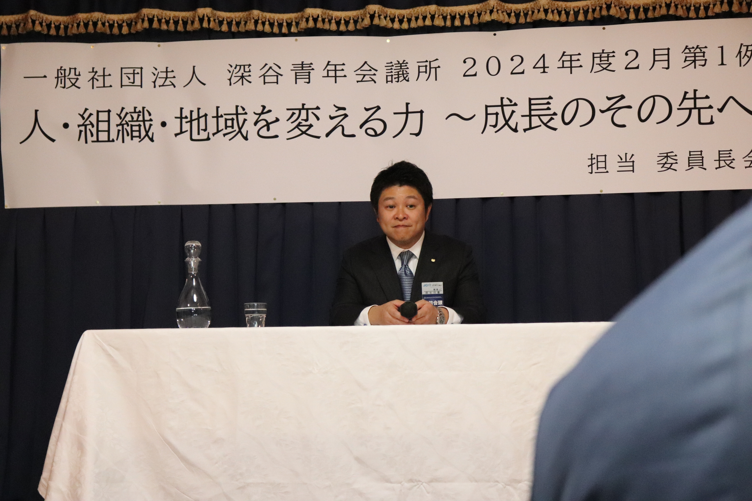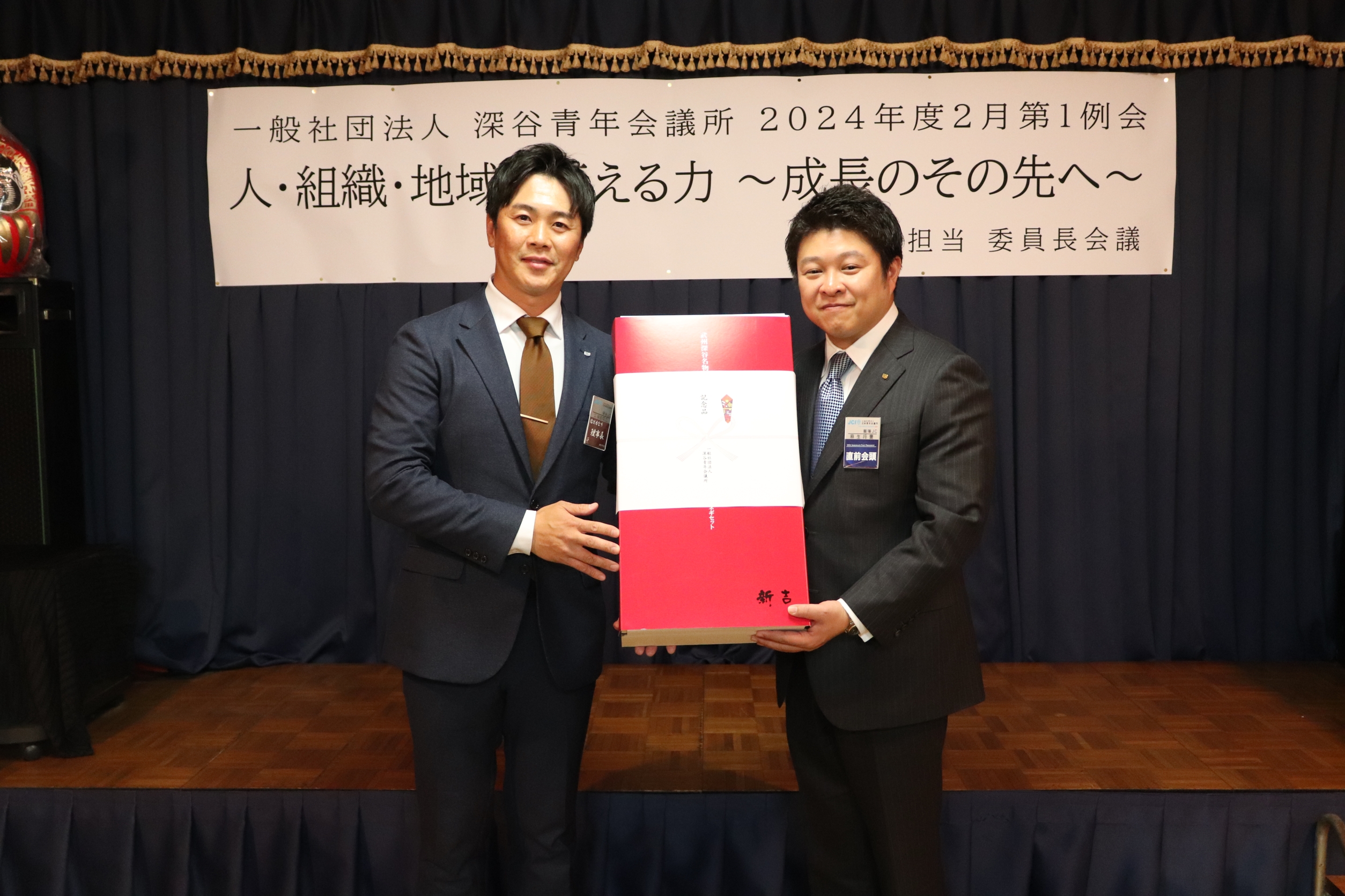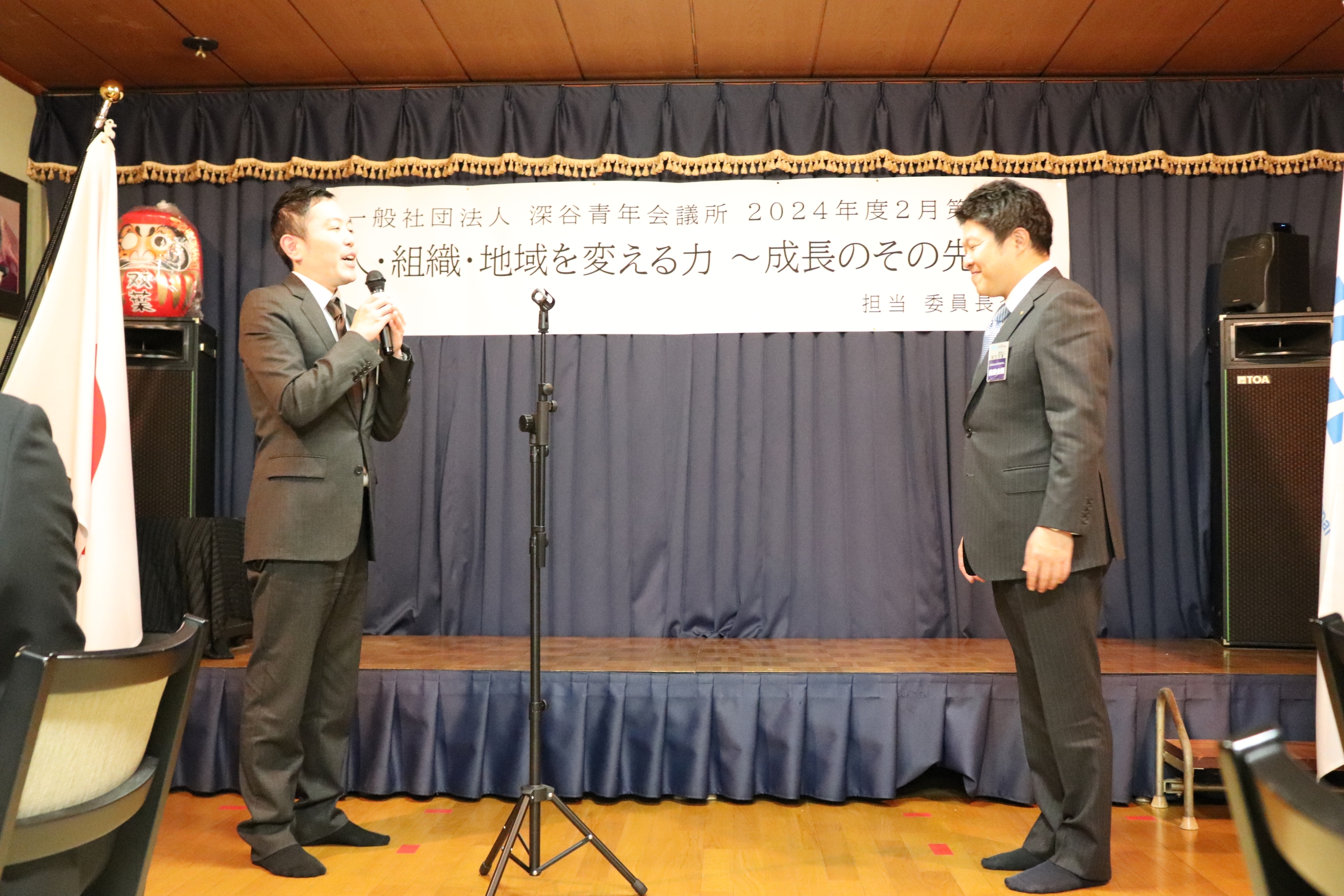 [メッセージ]割烹双葉にて2024年度02月第2例会「人・組織・地域を変える力~成長のその先へ~」を開催させていただきました。当日は公益社団法人日本青年会議所の直前会頭である麻生将豊君をお招きさせていただきました。麻生直前会頭に対し多くのメンバーやゲストの方々から質問を行いました。麻生直前会頭のこれまでの経験や知識を交えながらお話をしていただき、今後の運動につながる実りある時間になりました。ゲストの方々とも交流を図ることができ、一般社団法人深谷青年会議所がこれからも成長を続けていくことの必要性を改めて感じることができました。