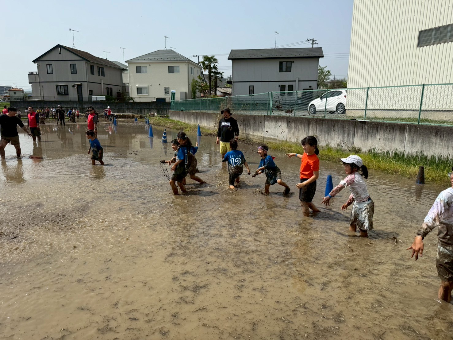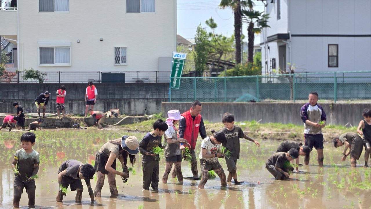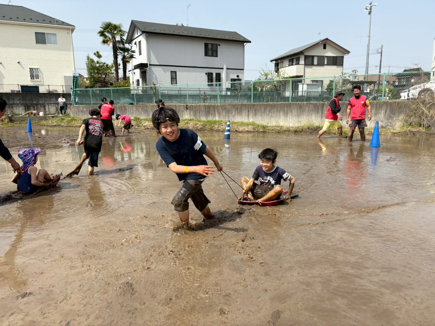 [メッセージ]青少年交流委員会が担当する例会「泥リンピック2025~深谷・寄居大会~」を寄居町内の田んぼで開催しました。深谷市・寄居町の小学生80人が参加し、田んぼの中での大運動会、そして田植えを行いました。初めて会った子ども同士でチーム競技に挑むことで、一人の時間では味わえない楽しさ、子どものコミュニケーション能力を養う機会を提供したいとの想いで企画した事業です。最初は田んぼの中に入ることに戸惑っていた子どもたちも、最後は全身泥だらけになりながら駆け回り、笑顔溢れる事業となりました。