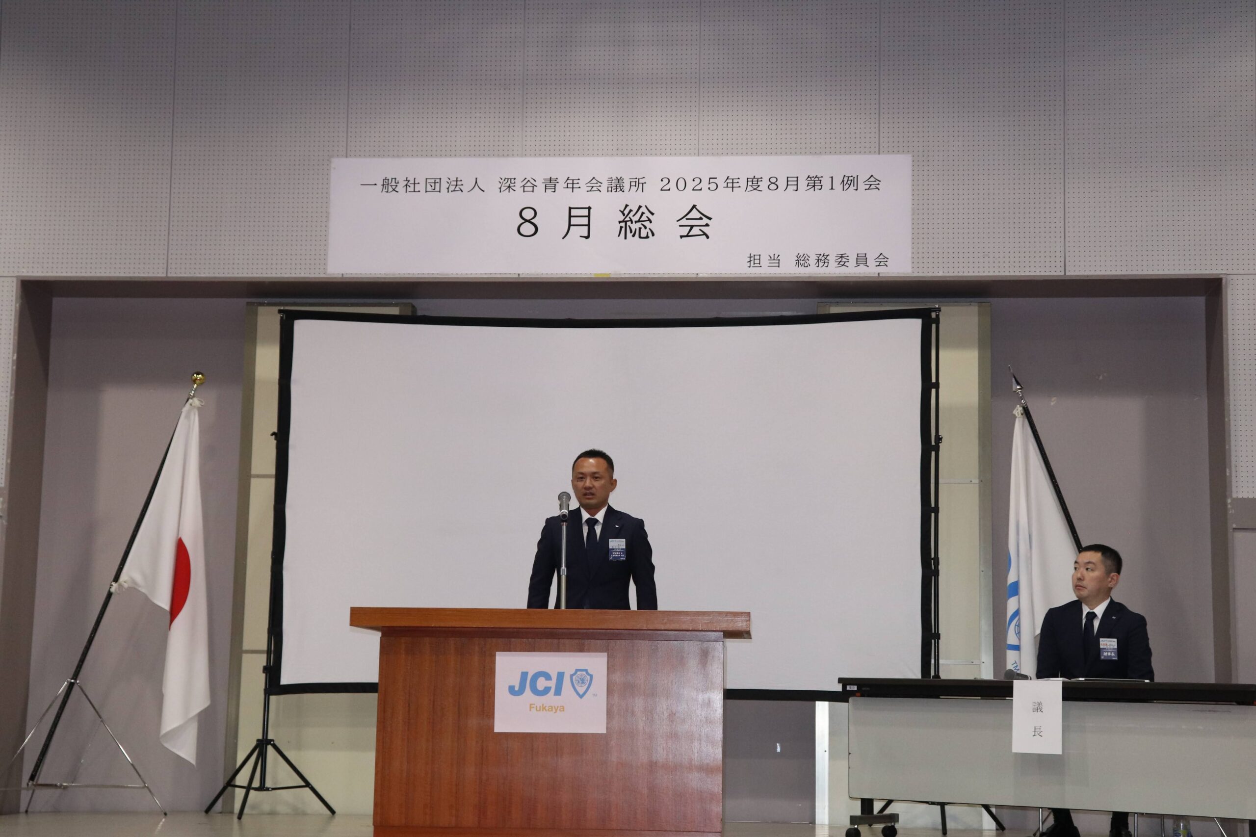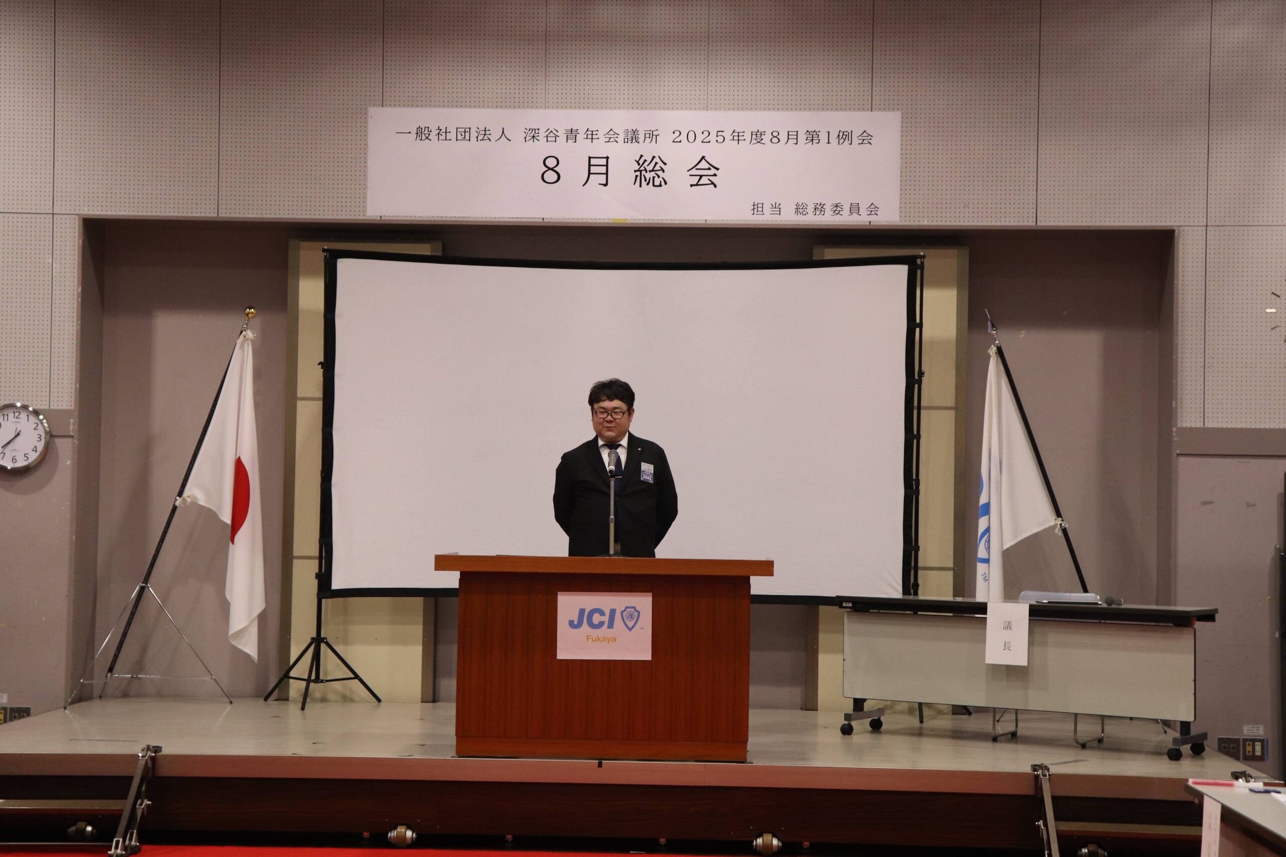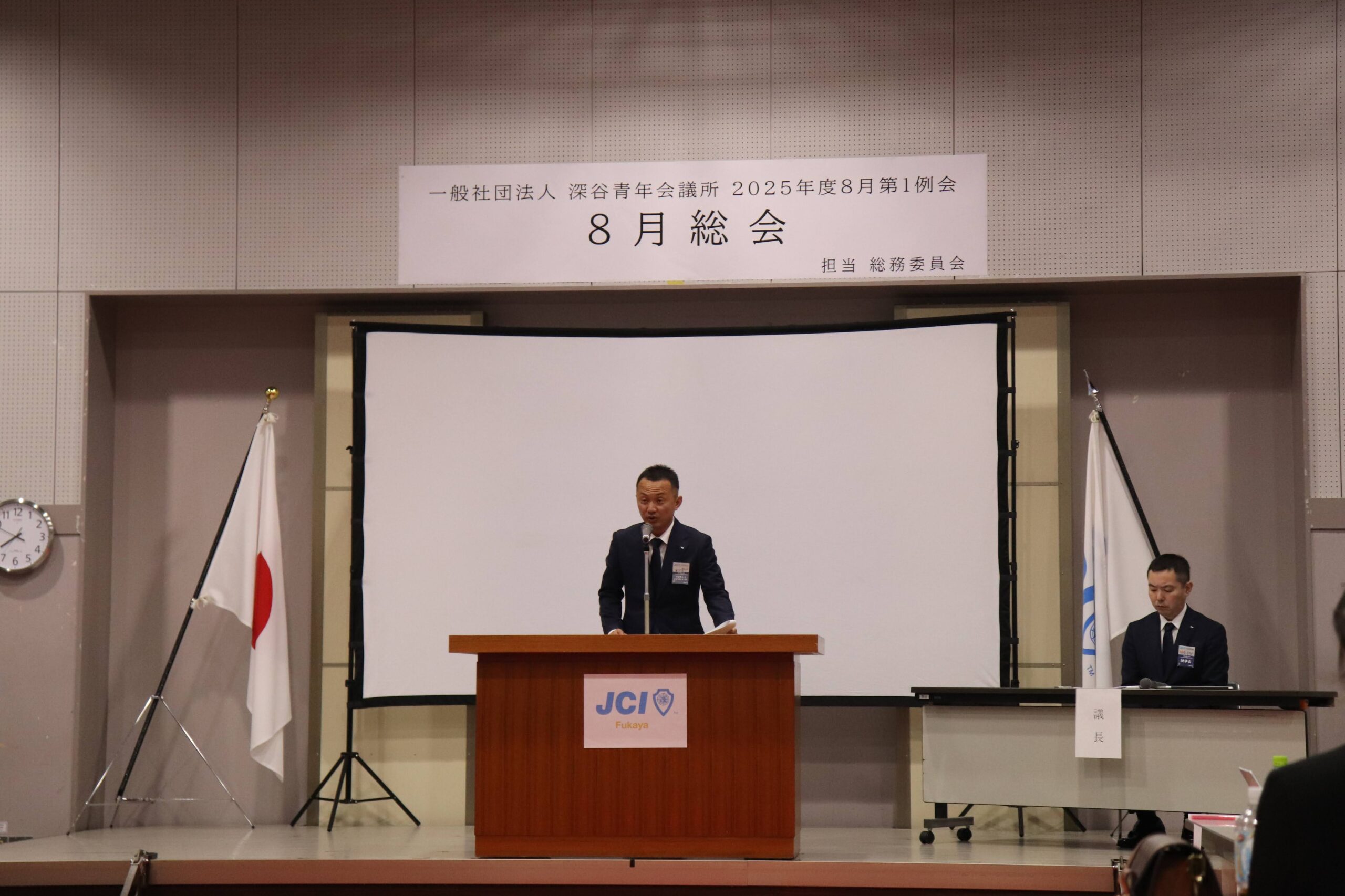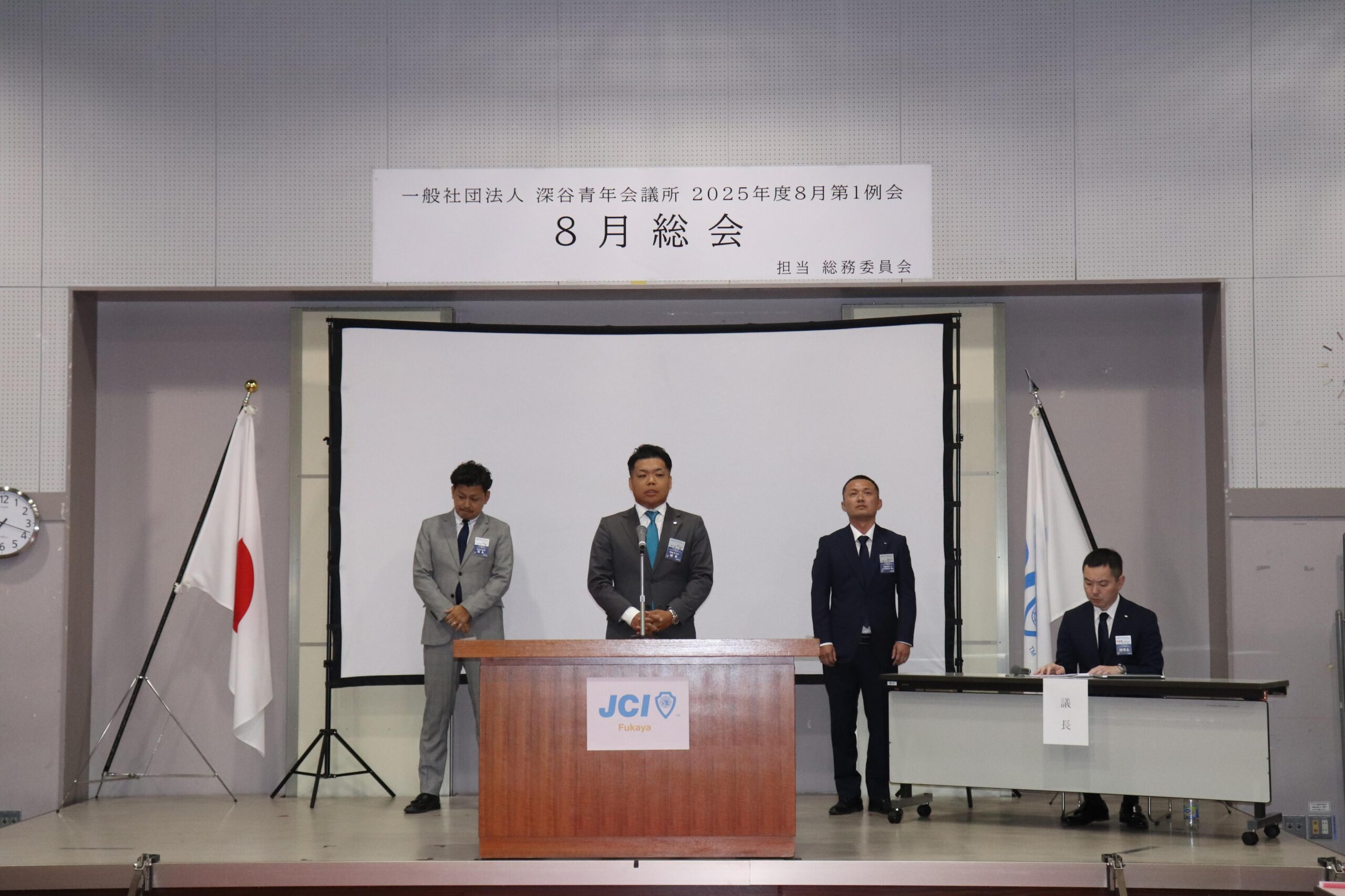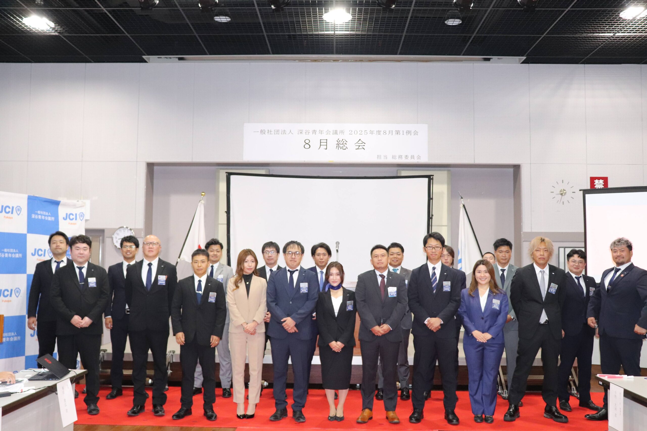 [メッセージ]2025年8月8日、深谷市花園文化会館アドニスにて「8月総会」を開催しました。本総会では、「2025年度第1次補正予算書」を審議し、これまでの予算が適正であったかを振り返るとともに、これからの活動をより良いものにするための再構築を行いました。また、2026年度の組織体制を決定し、理事長候補者の所信表明を通して、次年度の青年会議所運動に向けた想いを共有しました。審議では多くの質疑応答が交わされ、メンバー一人ひとりが当事者意識を持って真剣に議事に臨む姿が見られました。出向者報告でも活発な意見交換が行われ、学びと気づきのある総会となりました。