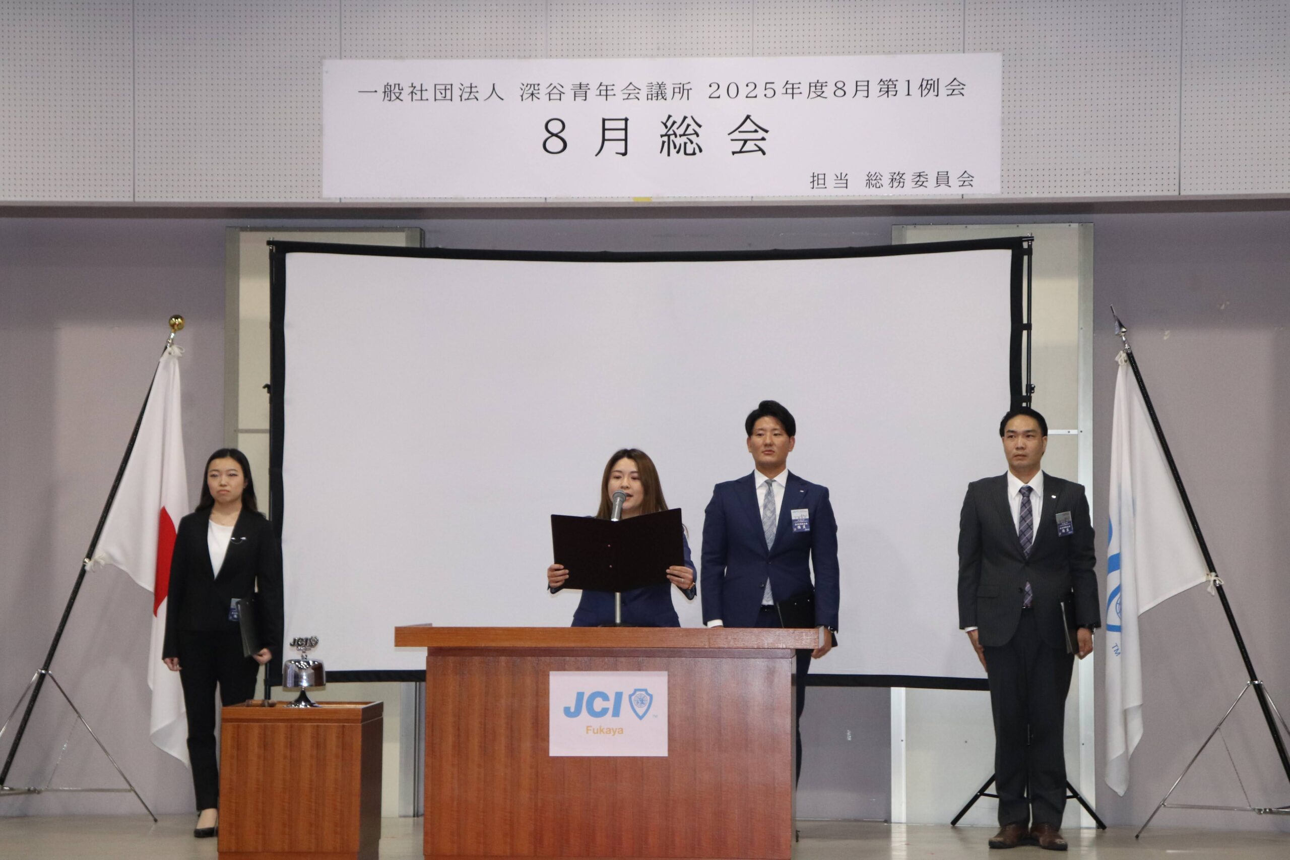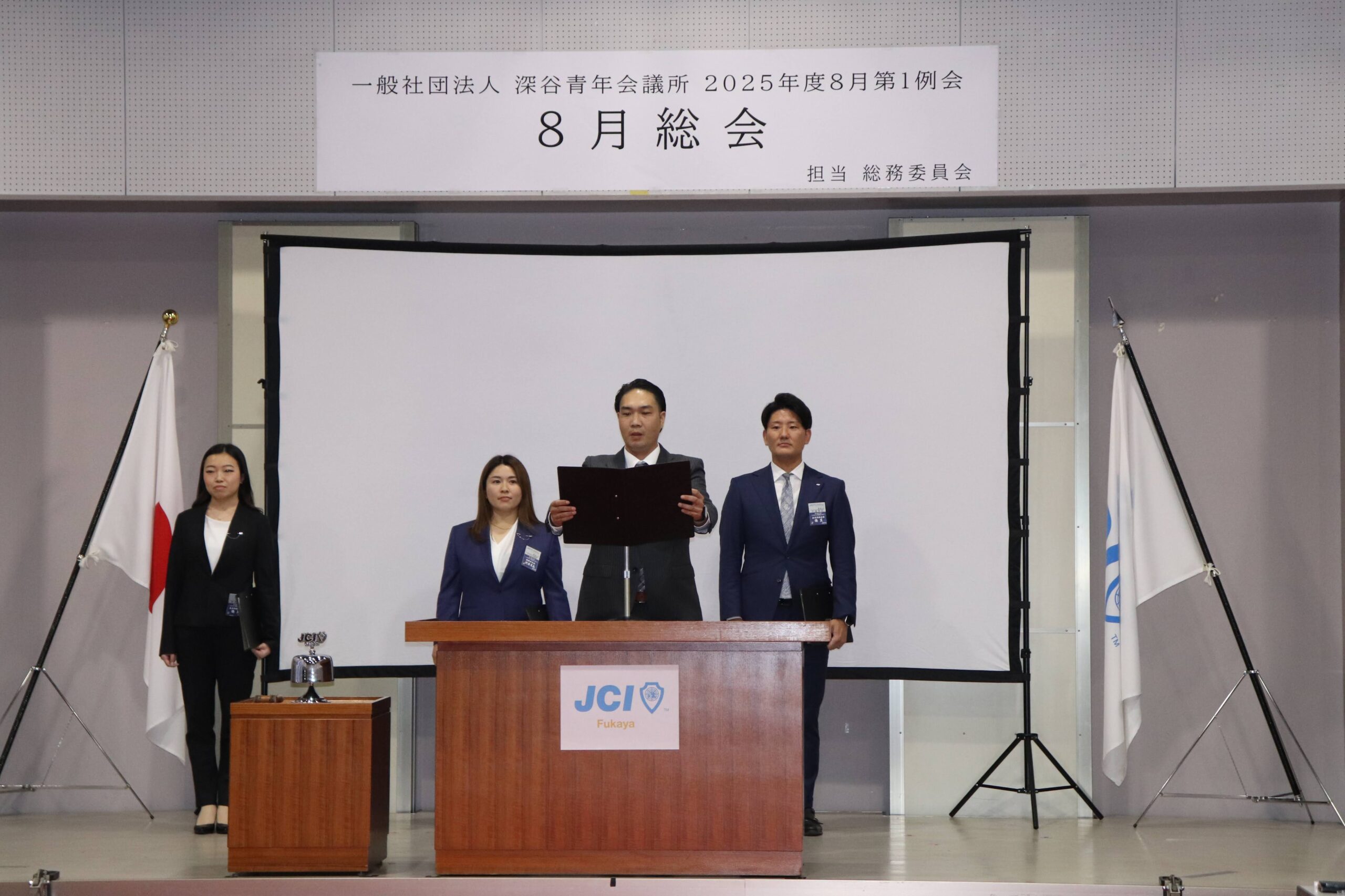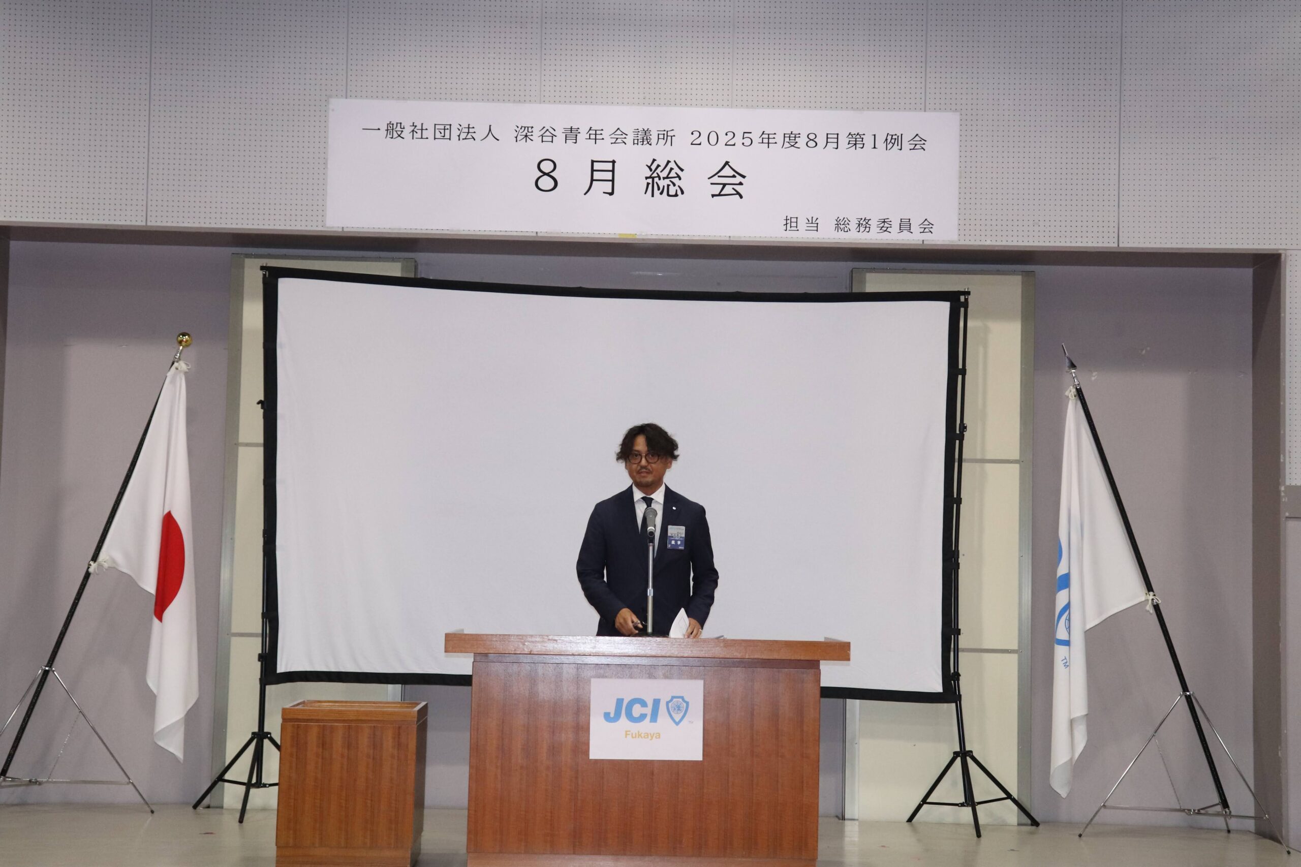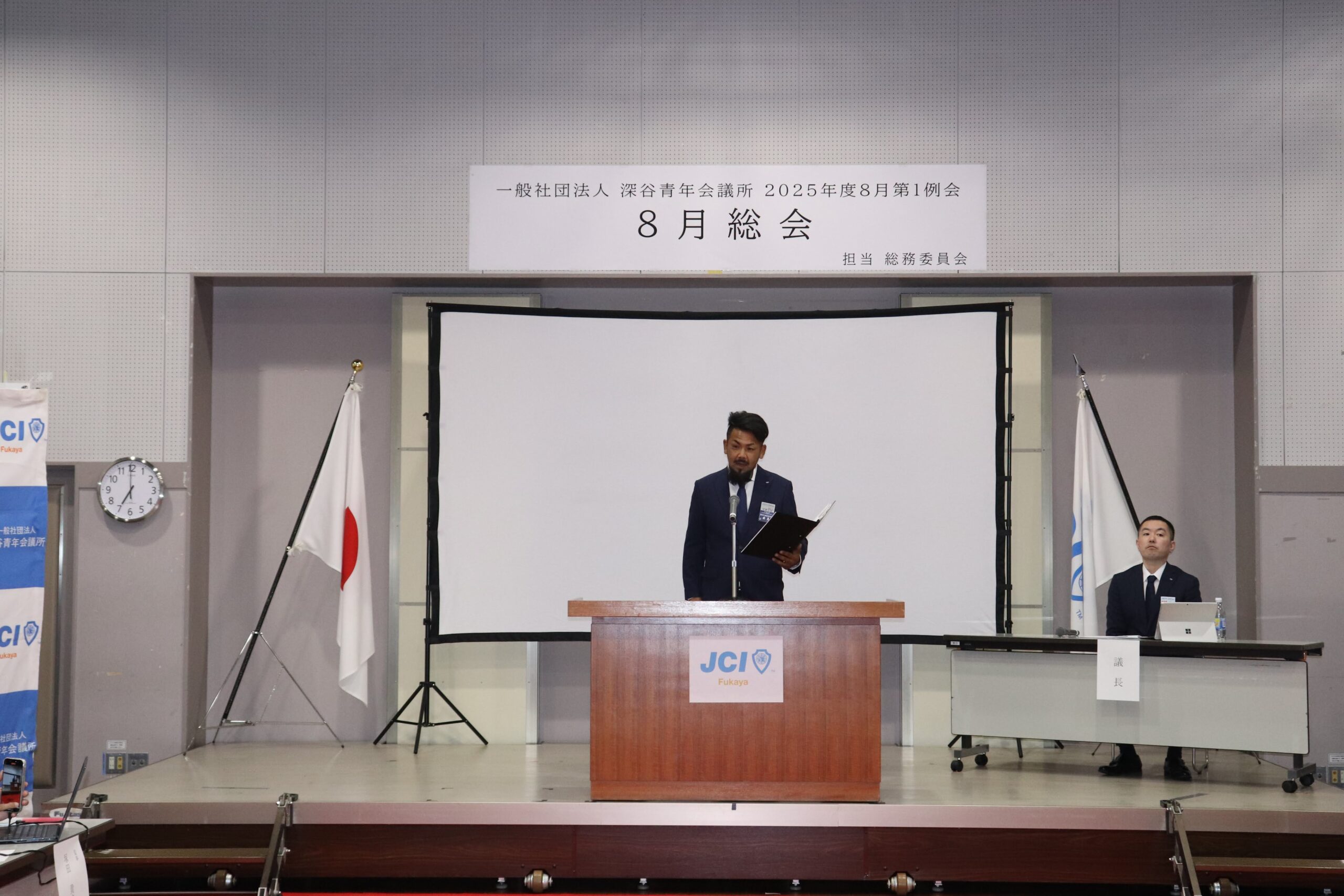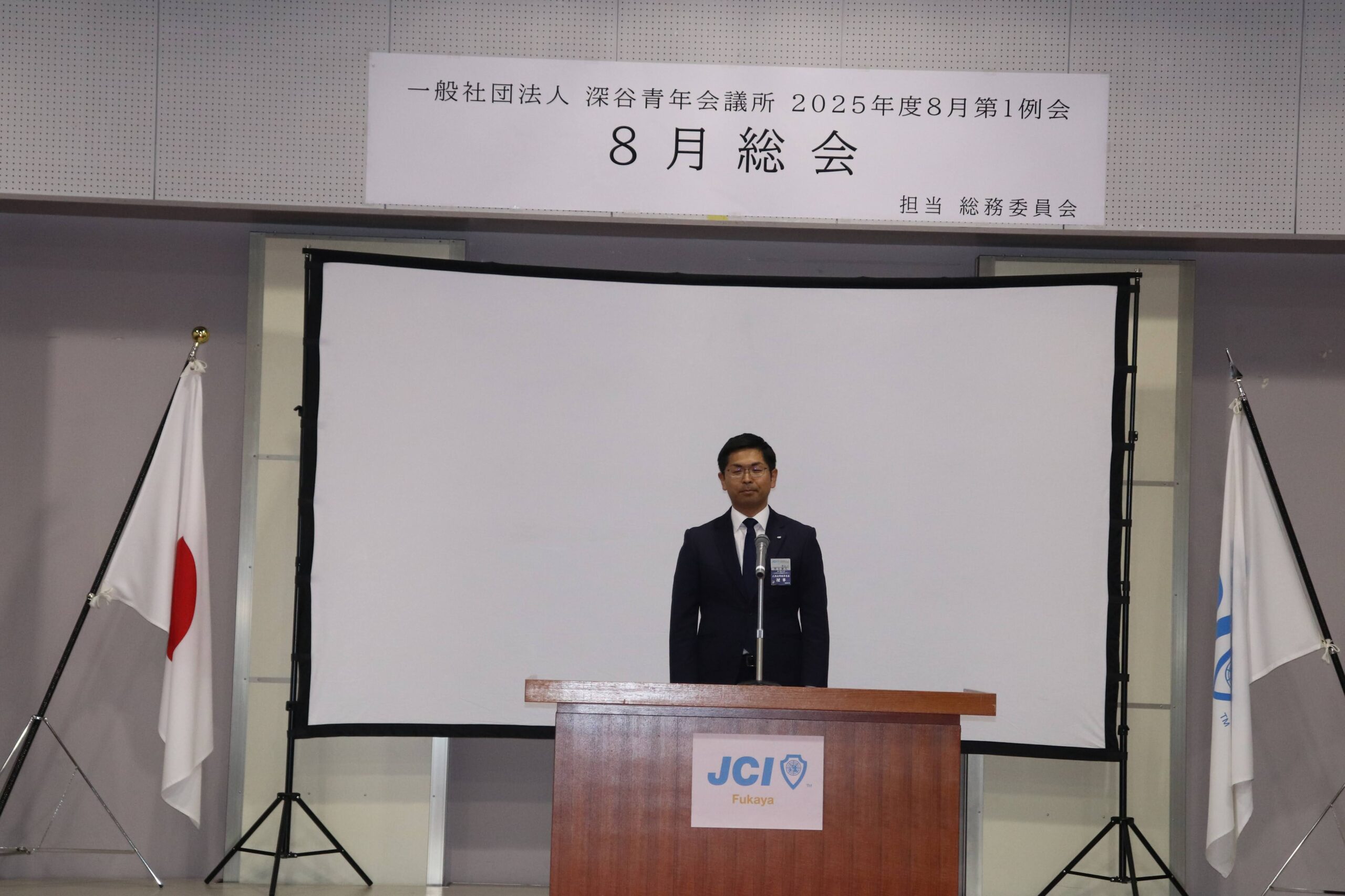 [メッセージ]2025年8月8日、深谷市花園文化会館アドニスにて「8月総会」を開催しました。本総会では、「2025年度第1次補正予算書」を審議し、これまでの予算が適正であったかを振り返るとともに、これからの活動をより良いものにするための再構築を行いました。また、2026年度の組織体制を決定し、理事長候補者の所信表明を通して、次年度の青年会議所運動に向けた想いを共有しました。審議では多くの質疑応答が交わされ、メンバー一人ひとりが当事者意識を持って真剣に議事に臨む姿が見られました。出向者報告でも活発な意見交換が行われ、学びと気づきのある総会となりました。