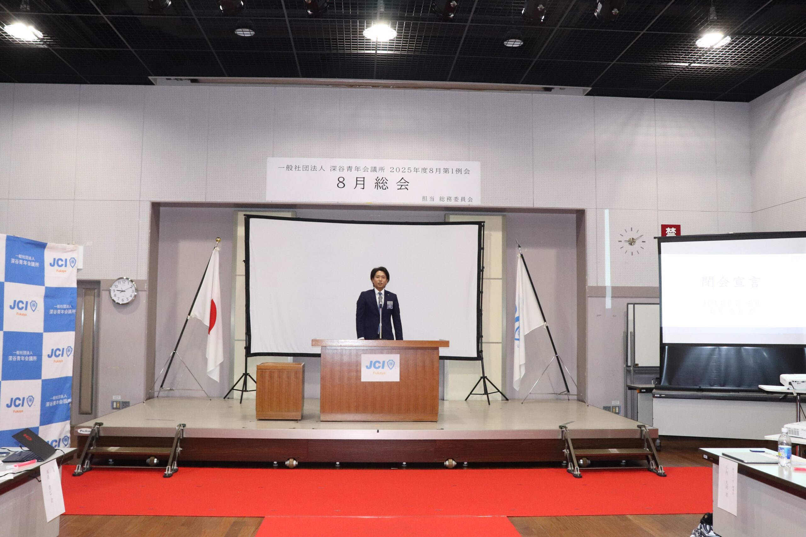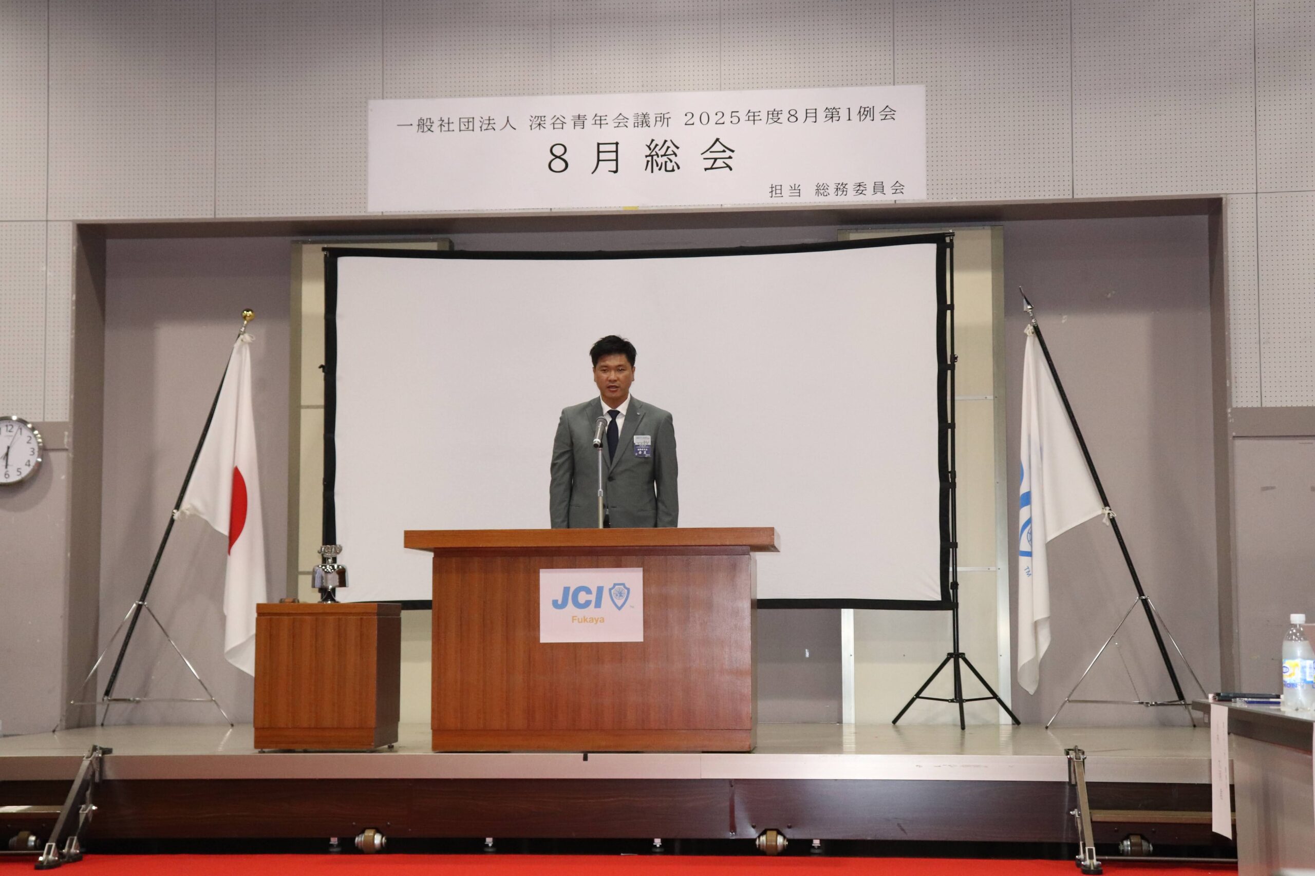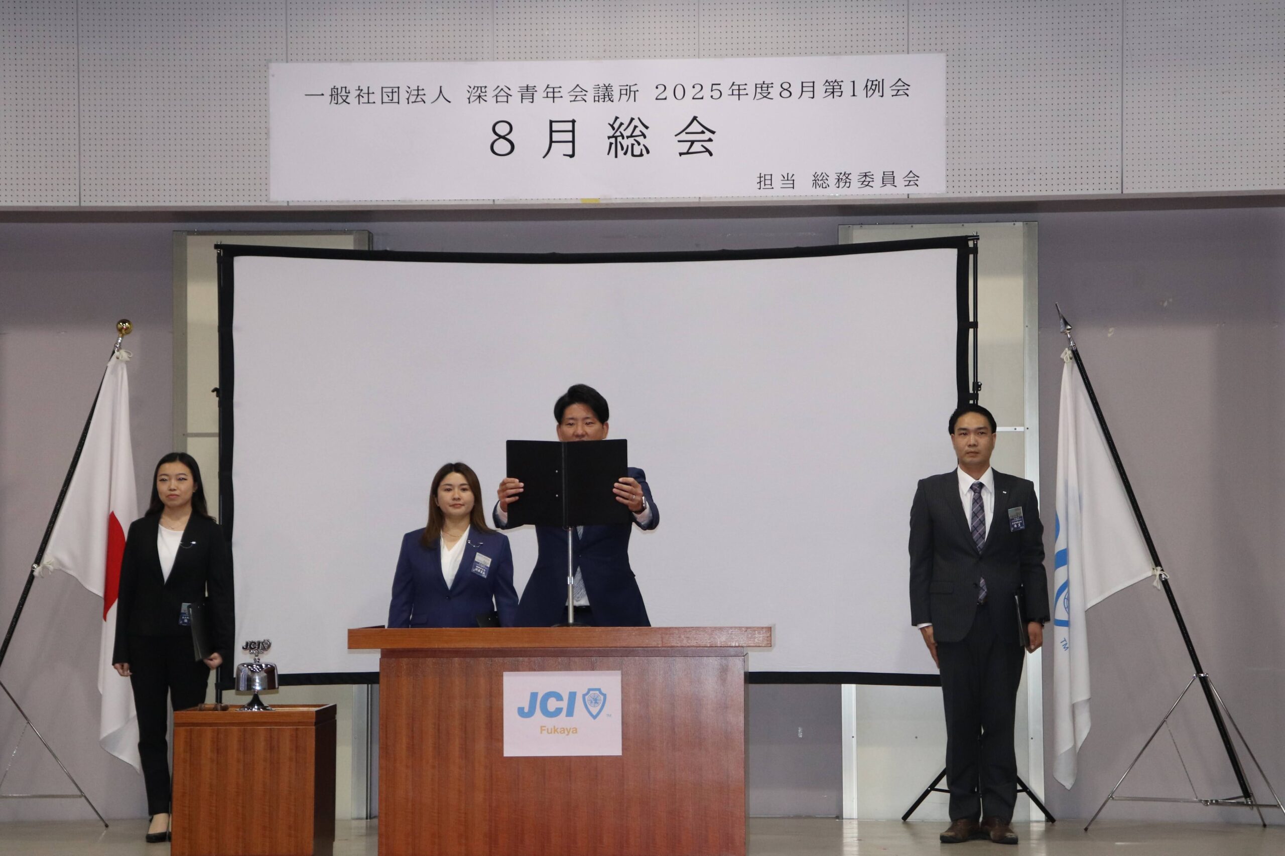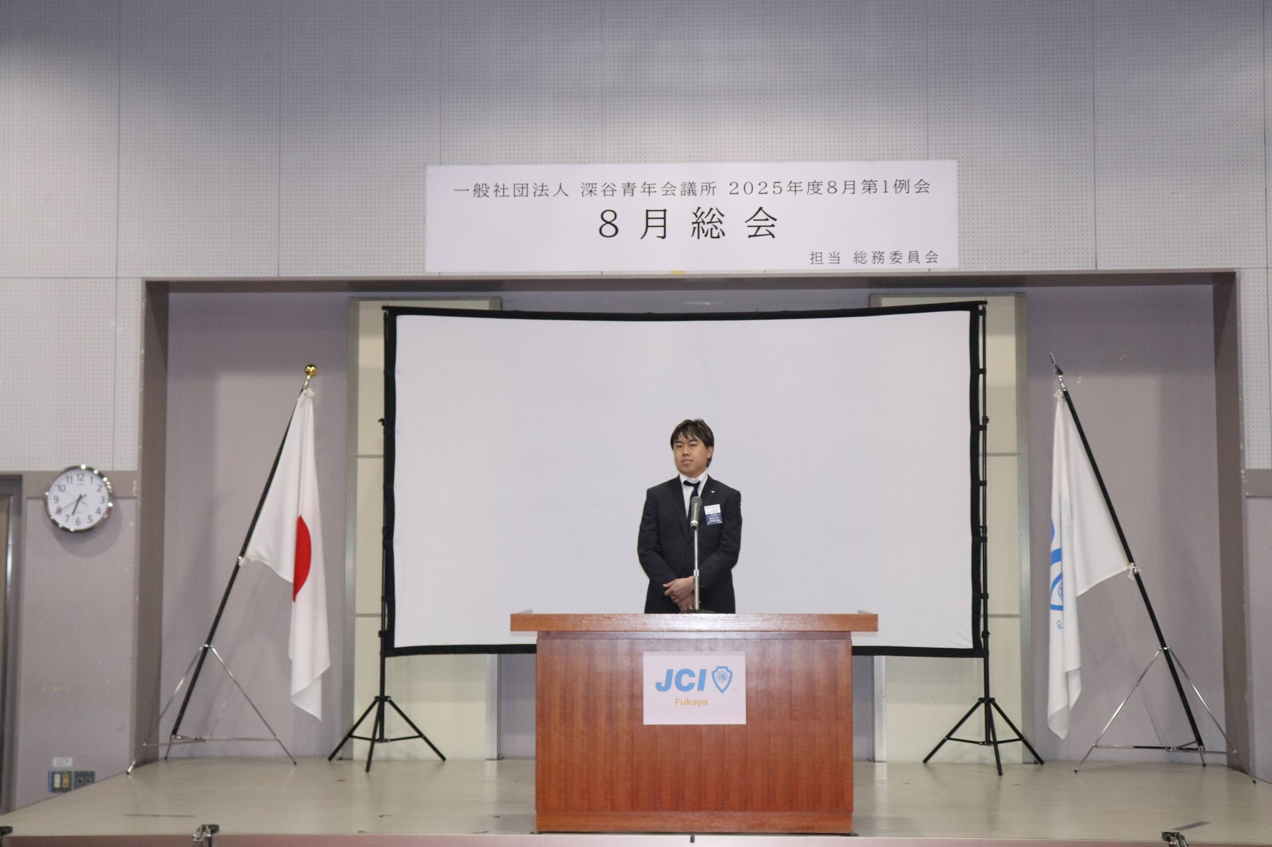 [メッセージ]2025年8月8日、深谷市花園文化会館アドニスにて「8月総会」を開催しました。本総会では、「2025年度第1次補正予算書」を審議し、これまでの予算が適正であったかを振り返るとともに、これからの活動をより良いものにするための再構築を行いました。また、2026年度の組織体制を決定し、理事長候補者の所信表明を通して、次年度の青年会議所運動に向けた想いを共有しました。審議では多くの質疑応答が交わされ、メンバー一人ひとりが当事者意識を持って真剣に議事に臨む姿が見られました。出向者報告でも活発な意見交換が行われ、学びと気づきのある総会となりました。