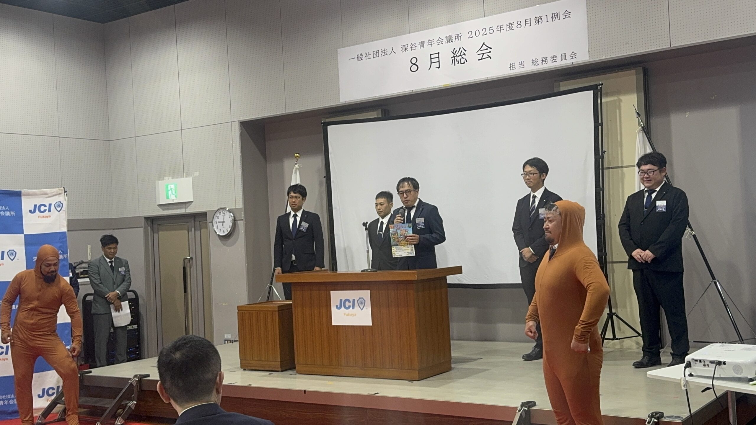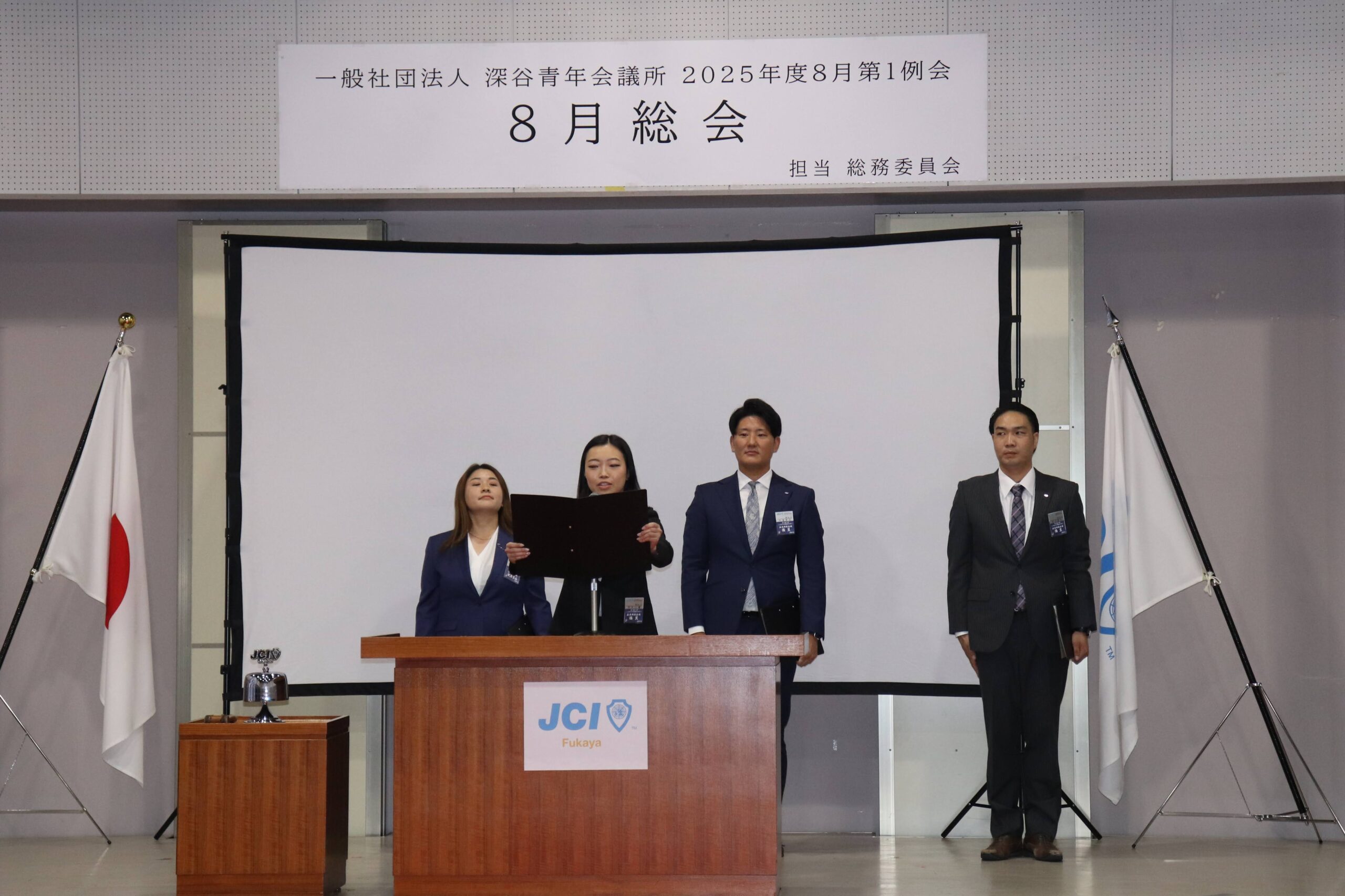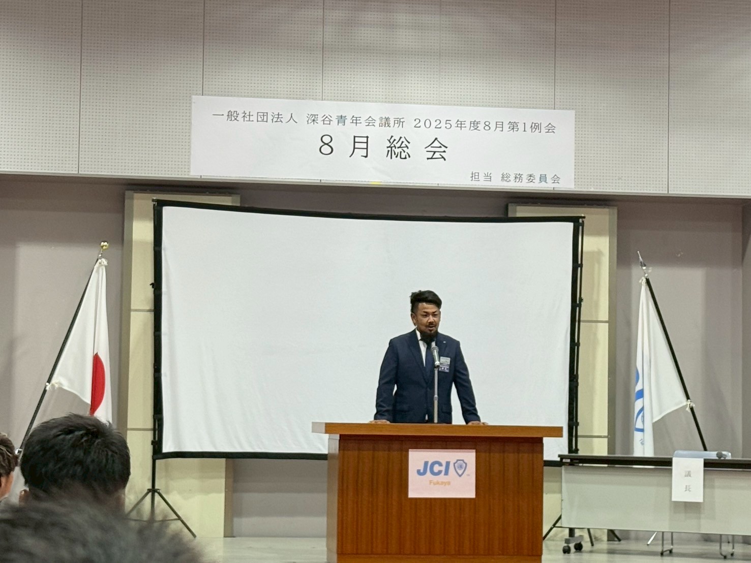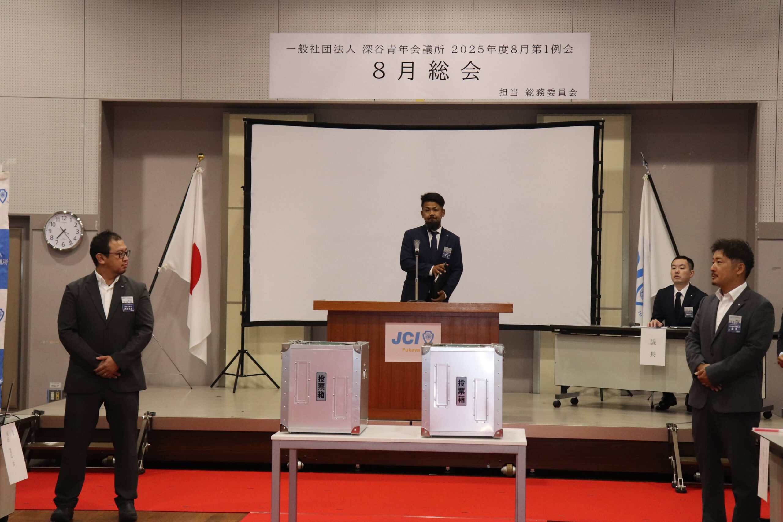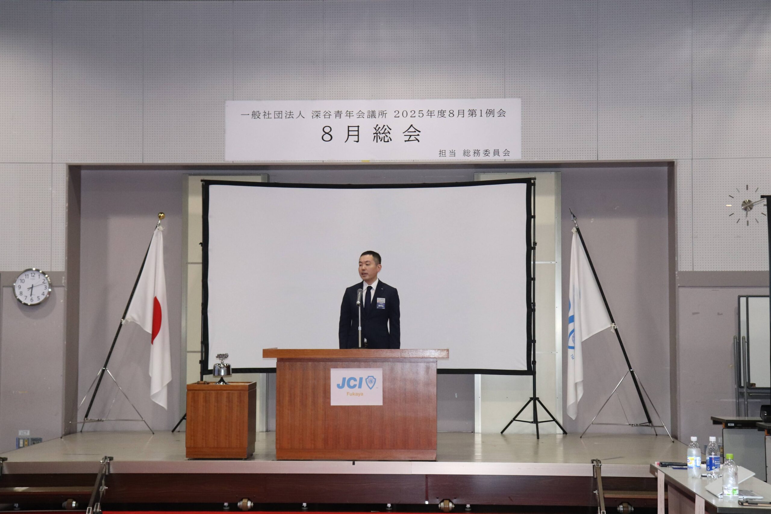 [メッセージ]2025年8月8日、深谷市花園文化会館アドニスにて「8月総会」を開催しました。本総会では、「2025年度第1次補正予算書」を審議し、これまでの予算が適正であったかを振り返るとともに、これからの活動をより良いものにするための再構築を行いました。また、2026年度の組織体制を決定し、理事長候補者の所信表明を通して、次年度の青年会議所運動に向けた想いを共有しました。審議では多くの質疑応答が交わされ、メンバー一人ひとりが当事者意識を持って真剣に議事に臨む姿が見られました。出向者報告でも活発な意見交換が行われ、学びと気づきのある総会となりました。