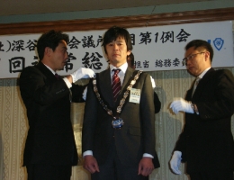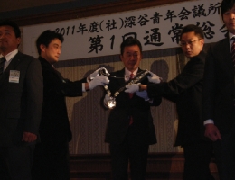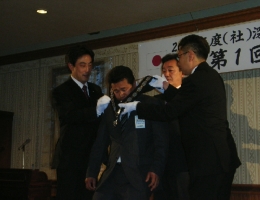 歴代理事長のみなさんの手により47代理事長:福地康生君の肩から外されます。